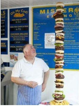 據(jù)英國《每日郵報(bào)》5月5日?qǐng)?bào)道,英國一家外賣店的老板日前成功做出了一個(gè)5英尺4英寸(約1.62米)高的巨型漢堡,據(jù)稱其刷新了世界最高漢堡的紀(jì)錄。