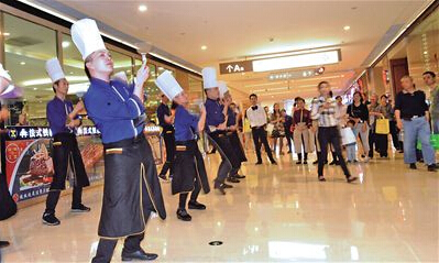 14日,大坪一餐館廚師跳鍋鏟舞,吸引市民眼球。