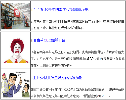 [摘要] 百勝集團公布第四季度財報虧損巨大,麥當勞CEO黯然下臺。春節近了,衛計委擬批準金箔為食品添加劑,因為熱議。