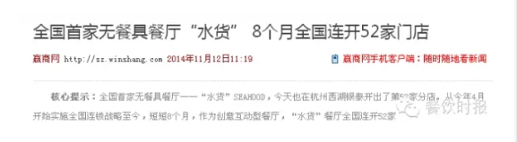 2013年9月開張至今的水貨,成為了中國餐飲轉(zhuǎn)型的催化劑:超炫的海底世界,無餐具徒手體驗、時尚潮流的視覺沖擊再加上一系列創(chuàng)新的產(chǎn)品和口味,使其在一年多的時間完成加盟近100家,11月全國落地開張52家,單店投資均不低于180萬,加盟費50-120萬不等,一年時間實現(xiàn)品牌盈利約近億元,創(chuàng)造餐飲品牌連鎖的奇速。