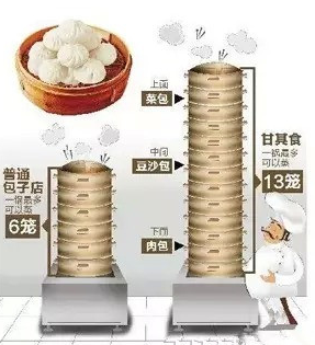 在甘其食,每個(gè)人都會(huì)看到壘得很高的蒸籠,如果細(xì)心一點(diǎn)你會(huì)發(fā)現(xiàn),其他包子店,頂多只能壘6層,不是不想多蒸幾籠提高效率,而是再高就熟不了了。甘其食最高能夠達(dá)到13層,“從9層到10層再到13層,這個(gè)是經(jīng)過了多少次試驗(yàn)、重新定制蒸鍋等設(shè)備才能達(dá)到的。”童啟華說,不光如此,下面幾層以下只能蒸肉包,中間幾層蒸豆沙包等都是有白紙黑字規(guī)定的,最上面只能蒸青菜香菇包。“蒸包子是有講究的,肉是生的,青菜香菇是半熟的,一定要同時(shí)熟才行。”