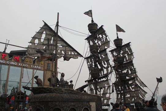 這家火鍋店的負責人告訴記者:“除了火鍋口味保證地道與原汁原味之外,我們玩的就是一個電影噱頭。”重慶是火鍋的重要發源地,火鍋又包含著重慶的碼頭文化,而電影《加勒比海盜》為觀眾一直熱追,所以設計團隊就決定用加勒比海盜船的模型來布置餐廳場景,并以“坐在船上吃火鍋”為餐廳主題。