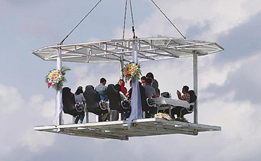 據聞,“空中餐廳”四周不設圍欄,享受餐飲服務的價格為每位8888元。看到“空中餐廳”被起重機吊著緩緩升空,不少圍觀市民嘖嘖稱奇,紛紛舉起相機、手機拍照留念,并感嘆:“這是用生命在吃飯呀!”、“這吃的不是飯,而是刺激體驗!”。