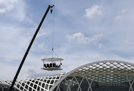 據了解,“空中餐廳”長4.5米、寬3米、高2.5米,重約3噸。加上8名顧客、1名廚師及1名服務員,重約4.5噸,由一臺重32噸、高40米的起重機吊在30米高空。