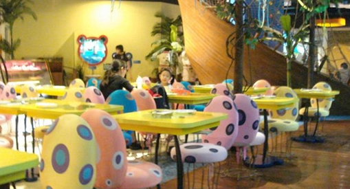 曾經紅極一時的連鎖兒童主題餐廳“芭迪熊”在其第一家店中,讓小朋友吃飯前先進行探險。小朋友們需要登上一條木制“帆船”,開始探險之旅:在沙灘區有“椰子樹”和花朵形餐桌;在海洋區,獨一無二的水母椅子、可愛的大蘑菇飲料站都很吸引小朋友。
