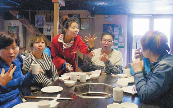 張玉壽說,2015年籌備餐廳時,他就和員工一起到玉龍縣職高進行了兩個月的培訓,從那時開始接觸手語,后來通過看書、看視頻自學及與員工的交流,如今,他與員工交流時可做到80%用手語。“只有融入他們,才能更好地認識他們。”
