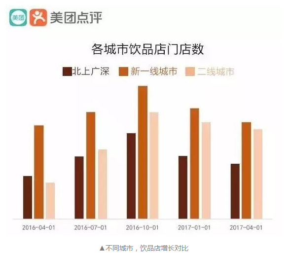 根據(jù)美團(tuán)點(diǎn)評(píng)最新公布的一項(xiàng)數(shù)據(jù)顯示,2017年4月,二線城市飲品店門(mén)店數(shù)同比增長(zhǎng)29%,而在北上廣深,這個(gè)數(shù)字是6%。
