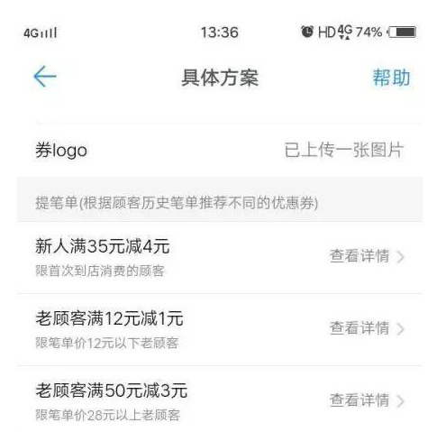 對新顧客,會按照餐廳的人均消費,以及餐廳的預算,進行滿減,對老顧客則會根據他的消費記錄,給他發放合適的代金券,不會因為代金券滿減的門檻太高,或優惠力度太小,而讓代金券成為廢紙、形成營銷誤傷,還能根據情況給出拉復購的方案。