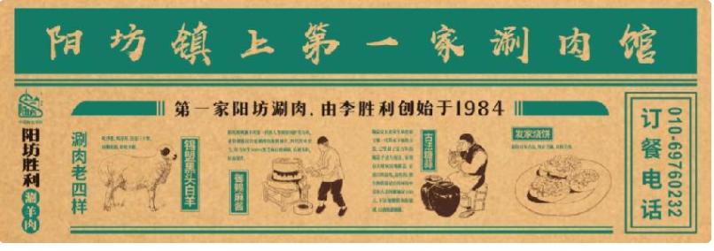 首先確定了陽(yáng)坊鎮(zhèn)老店的門頭上的品牌故事:第一家陽(yáng)坊涮羊肉由李勝利創(chuàng)始于1984,強(qiáng)調(diào)“陽(yáng)坊涮羊肉,勝利才正宗”。